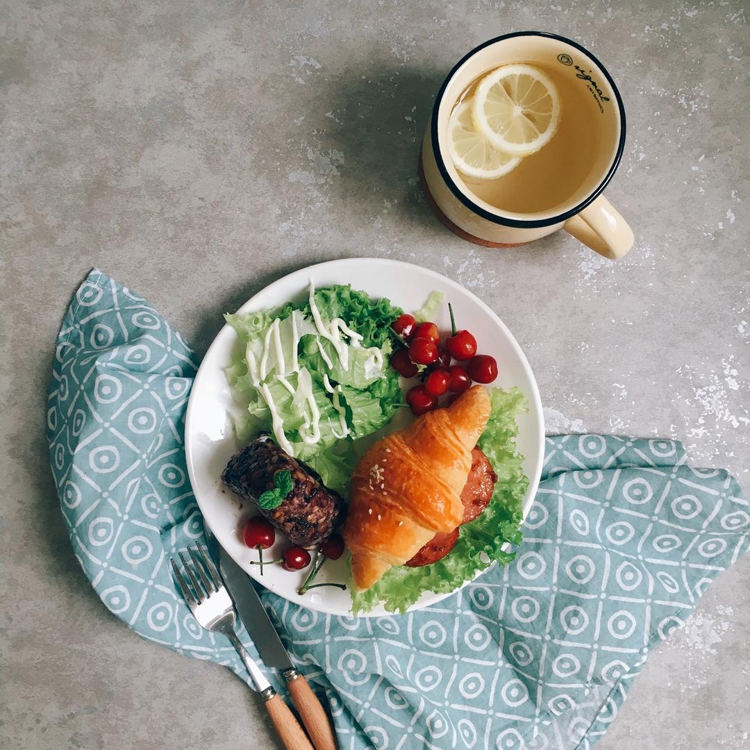 今天吃的杂粮饭团 可颂三文治 蔬菜水果沙拉 蜂蜜柠...