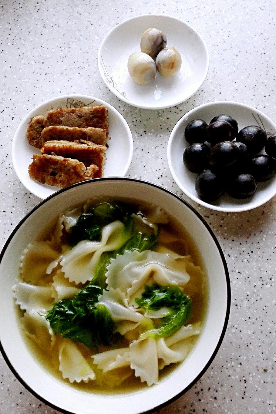 清汤蝴蝶面+煎肠+葡萄+鹌鹑蛋