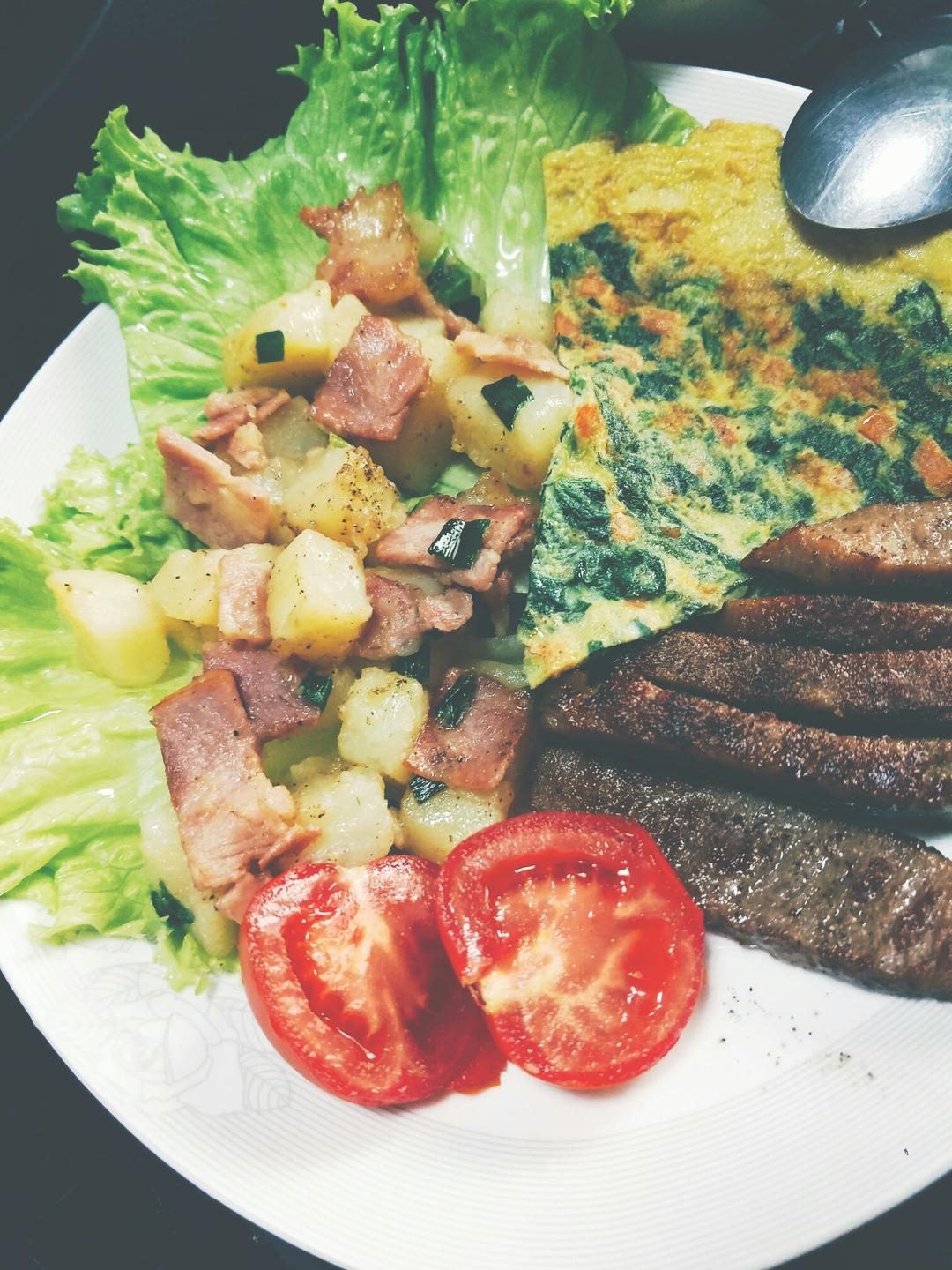 2017.5.4 番薯粥+菠菜鸡蛋饼+土豆培根+牛排