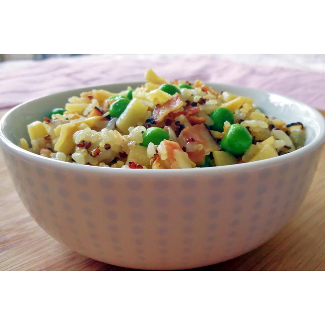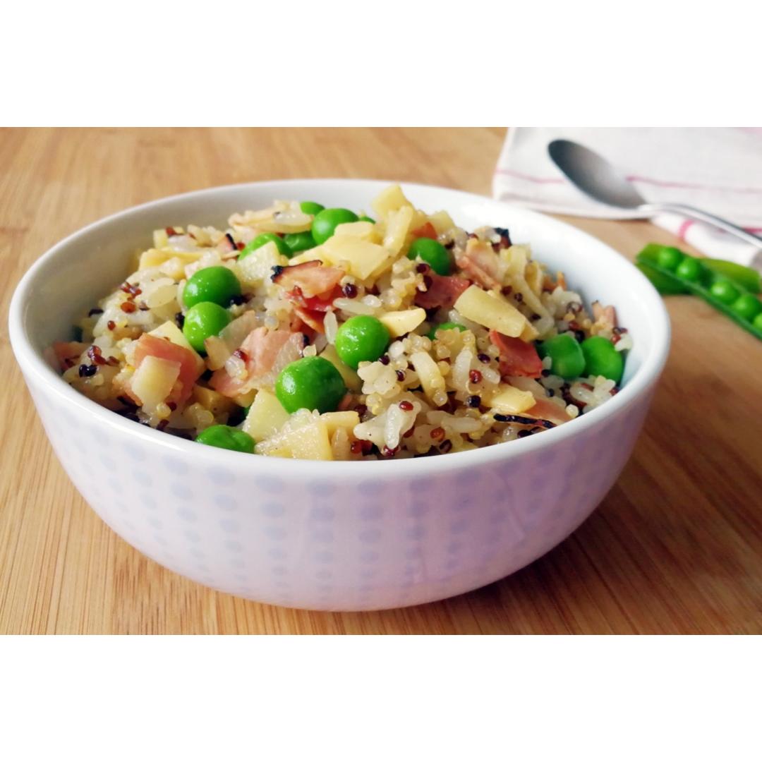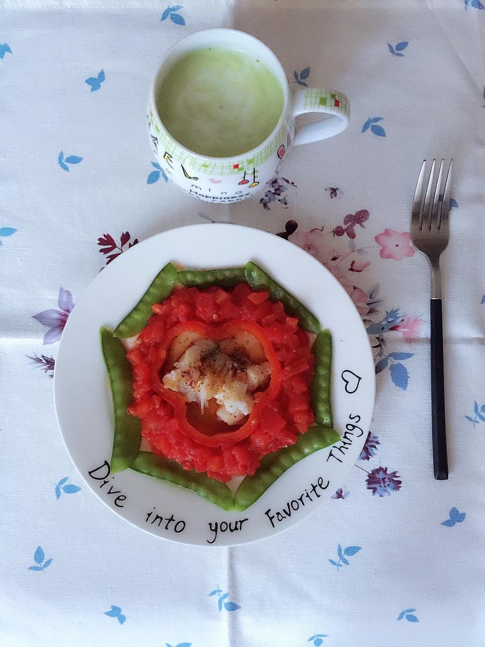香蕉牛油果奶昔+蒸鳕鱼橄榄油炒番茄粒煮荷兰豆