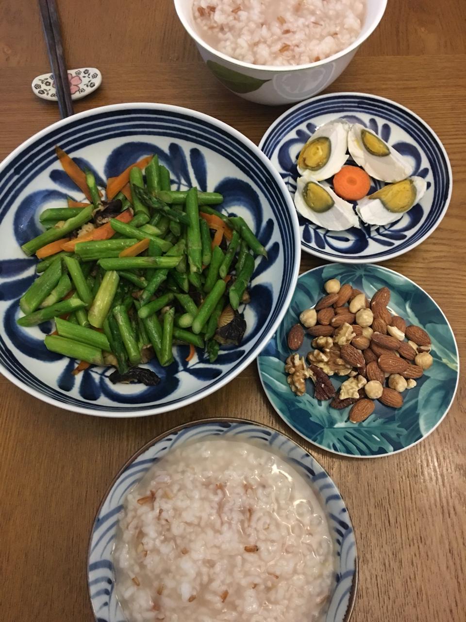稀饭芦笋咸蛋坚果。今日立夏祝大家夏安!