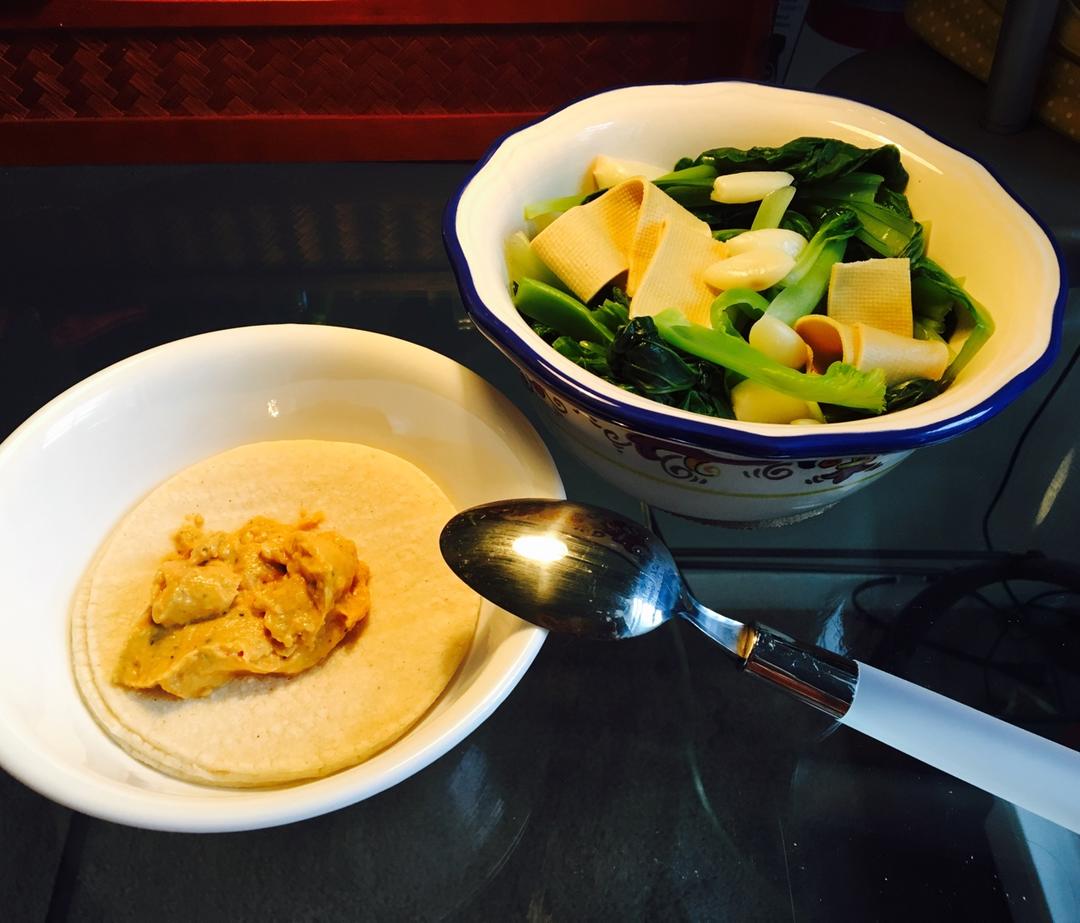 煮塌菜,芥菜和豆腐皮,白玉米tortilla和jalapeño cilantro hummus。昨天买这个hummus时...