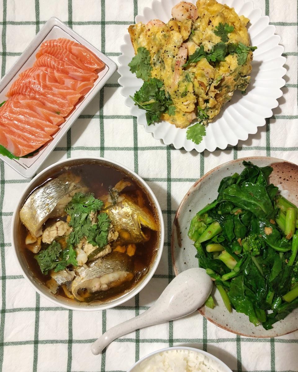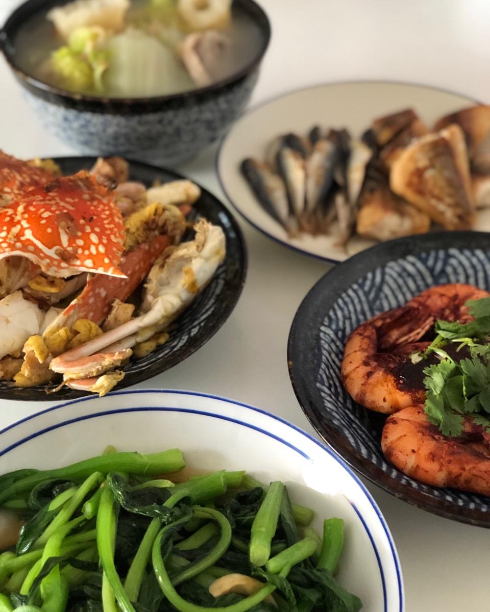 螃蟹炒鸡蛋、红糟虾、菜心&家乡的咸鱼再加一碗白菜鱼鳔干贝汤