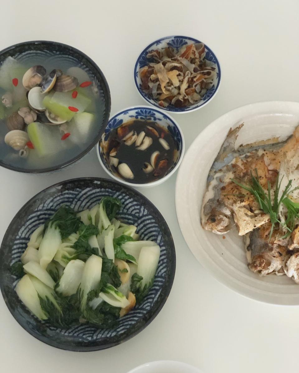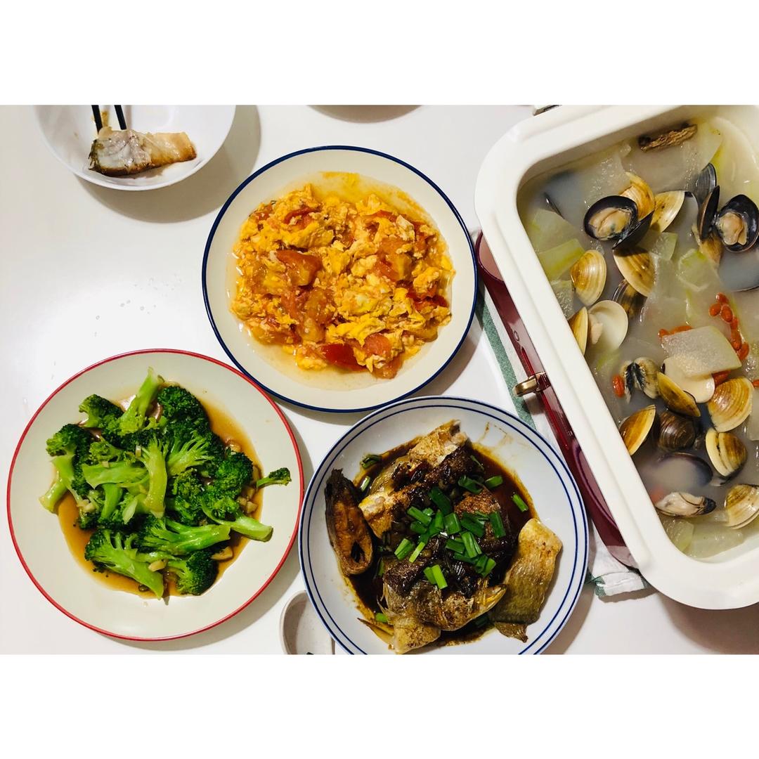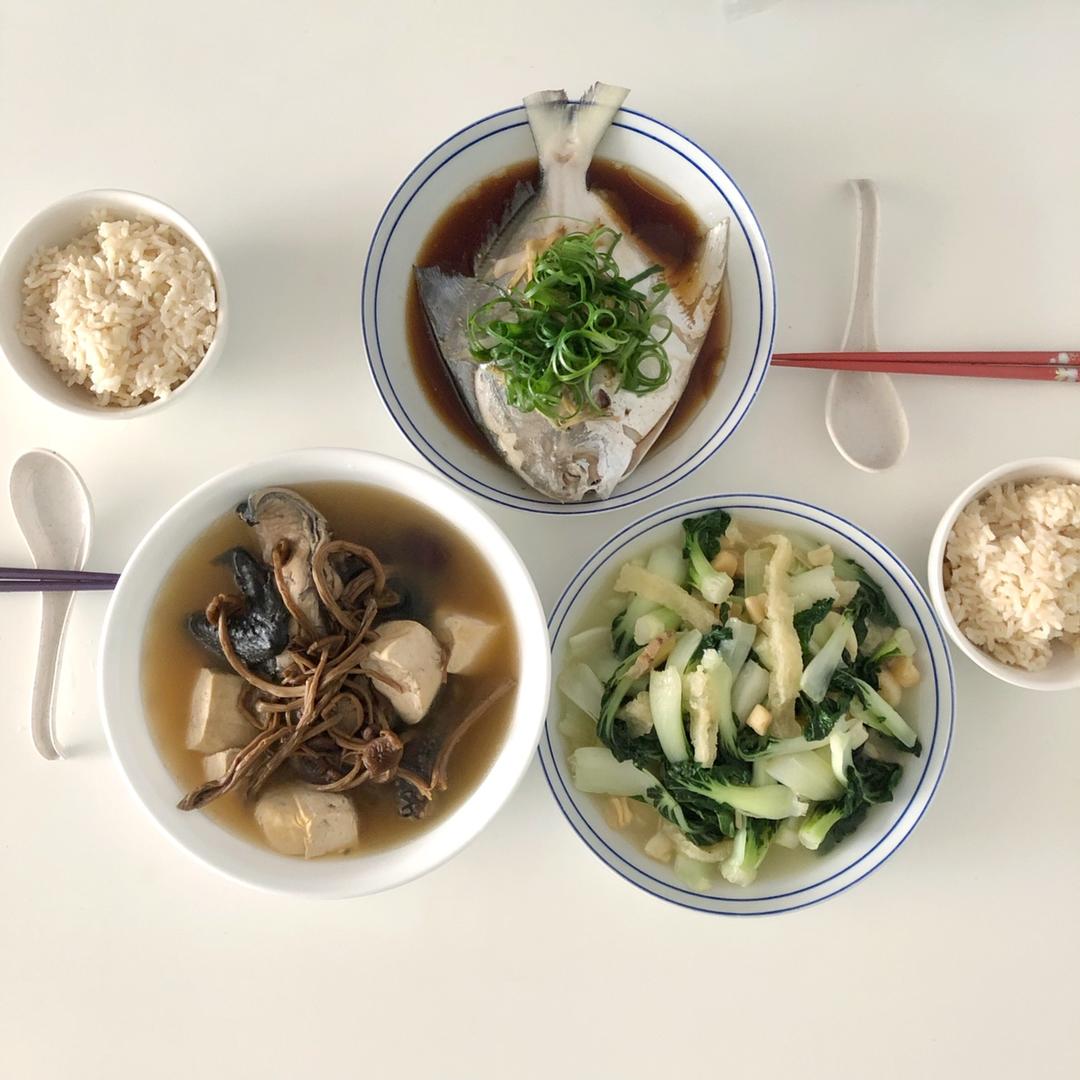 香煎鲳鱼、清炒奶白、冬瓜蛤蜊汤&海蜇皮