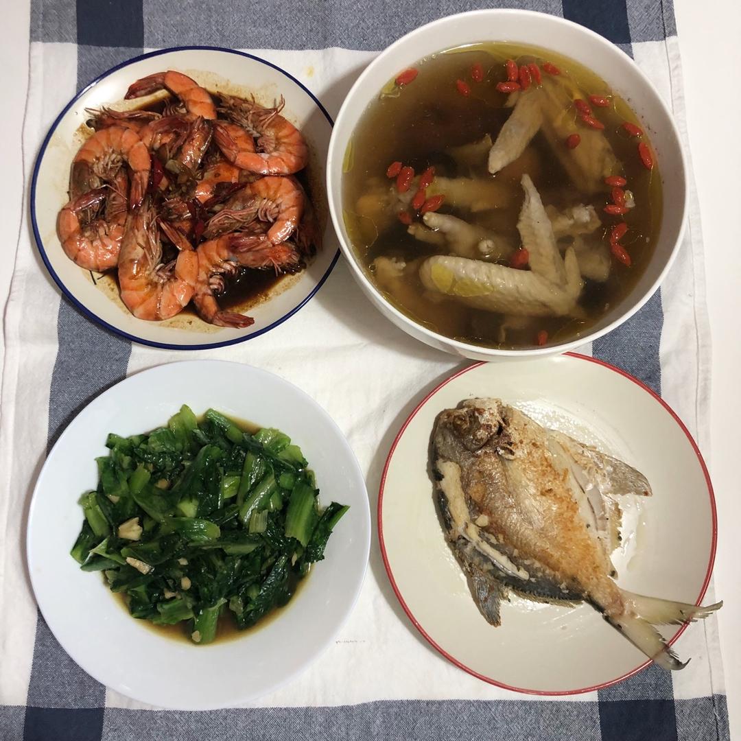 酱油虾、蚝油炒油麦菜、香煎鲳鱼