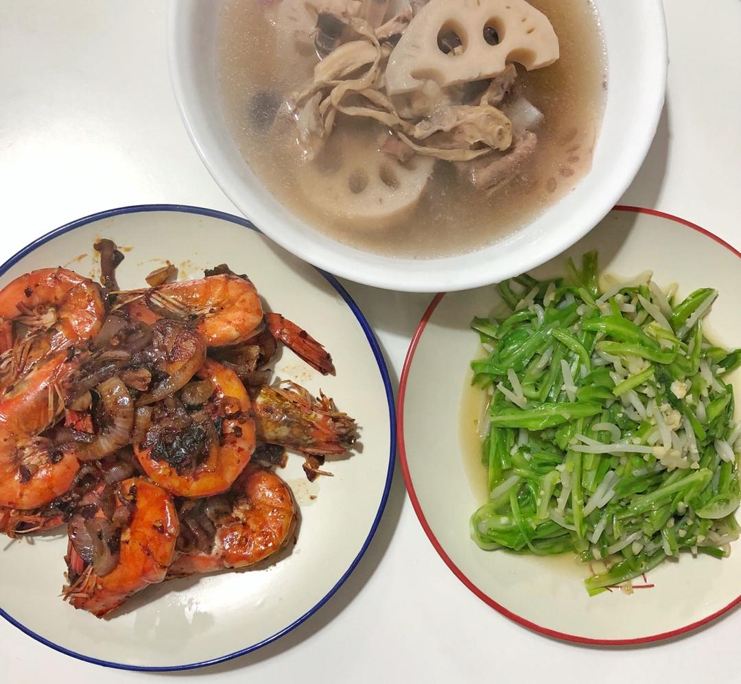 香辣虾、豆芽炒青龙菜