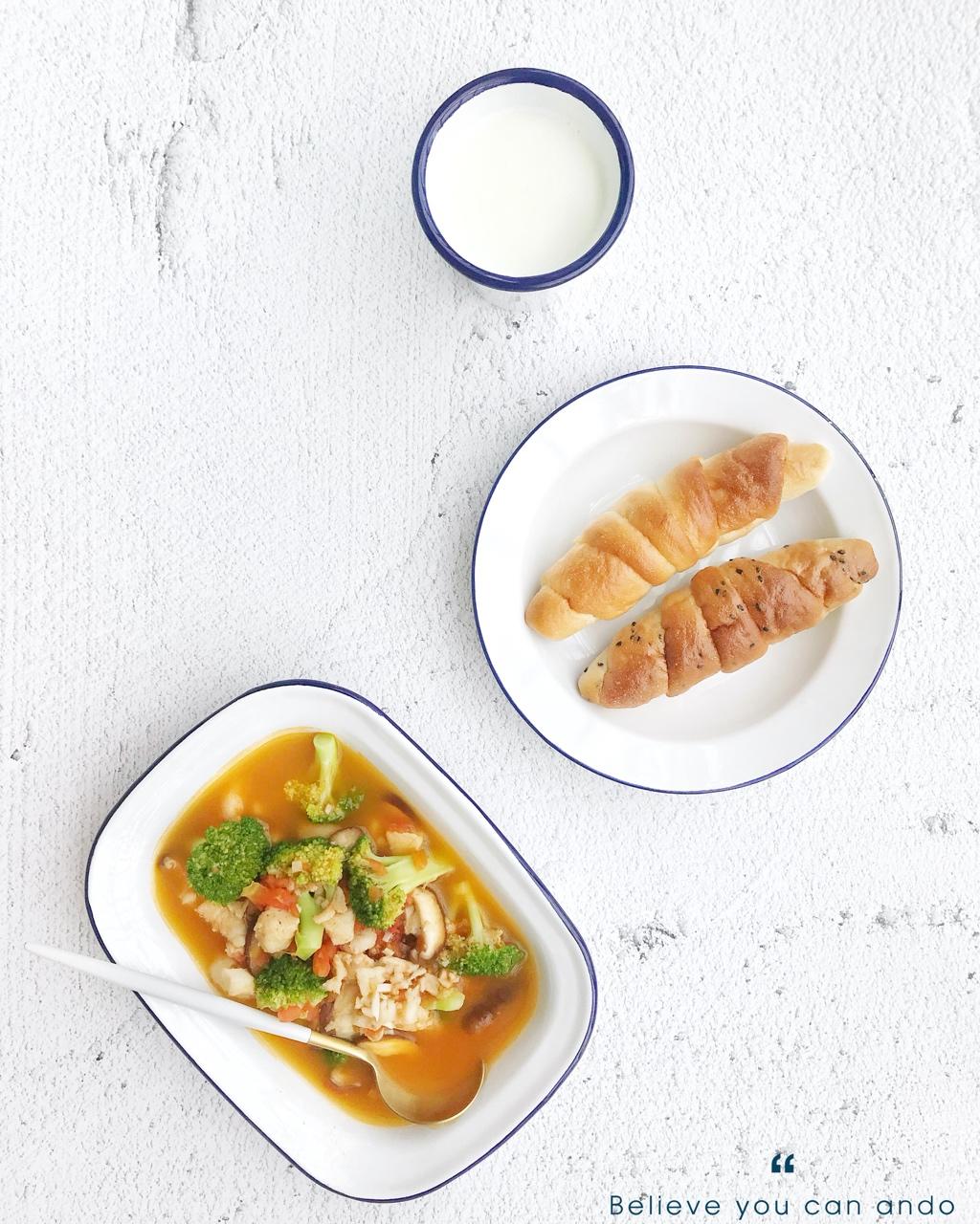 D446:番茄蔬菜巴沙鱼汤+海盐卷/芝麻卷+牛奶