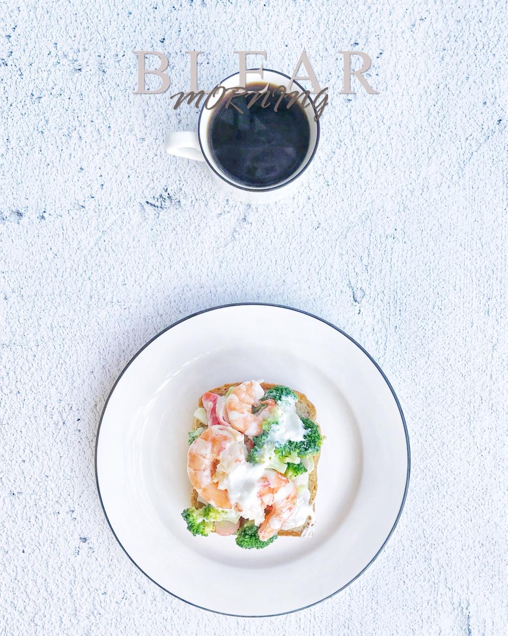 西兰花大虾酸奶沙拉厚切吐司开放三明治+咖啡