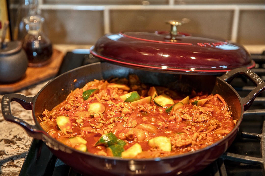 专栏一里的番茄牛肉酱用火鸡肉馅儿做的,关火前放节瓜块。特意切的滚刀块是为了保持口感。拌饭、拌面、当热压三明治馅儿都行。#...