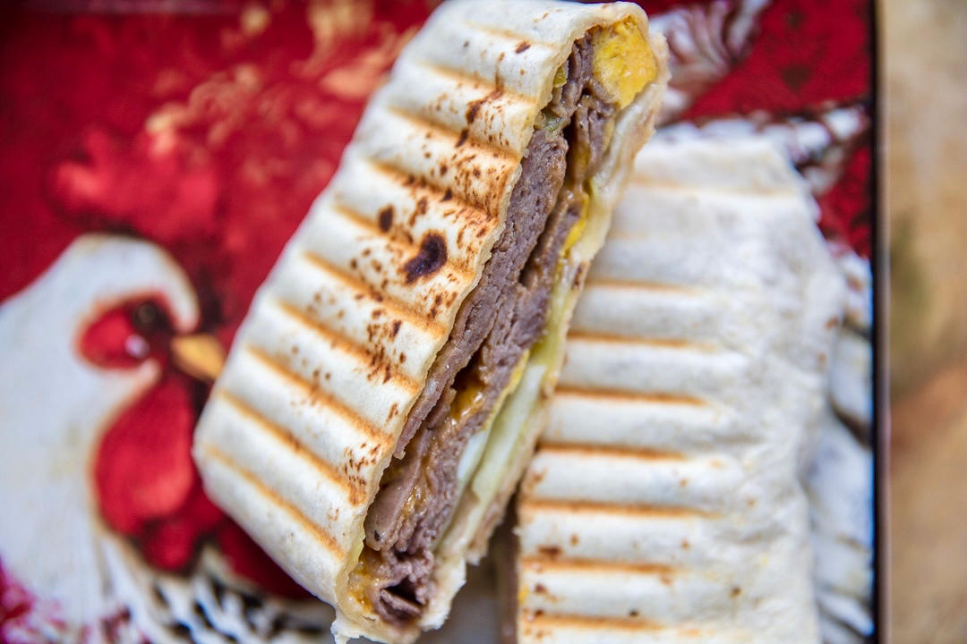 今天试试直火大卷饼,牛肉+芥末酱番茄酱+黑胡椒粉+洋葱丝+奶酪+生菜,酱料要多放,大汉堡味儿。