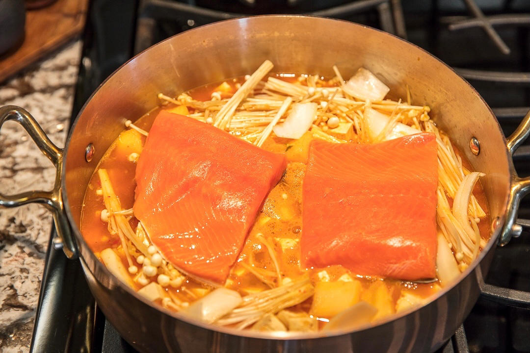 三文鱼泡菜闷饭。杂谷米,金针菇,三文鱼,出锅时准备qiao点韭菜,跟小龙说让他上院里剪两根儿韭菜去。