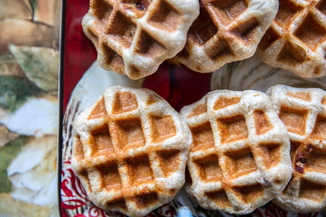 大饼课里的面胚,原配方分8份,包红豆沙馅儿,华夫饼模具抹点椰子油,压2-3分钟即可。别压太久,太久会发干。刚上色就行,可...