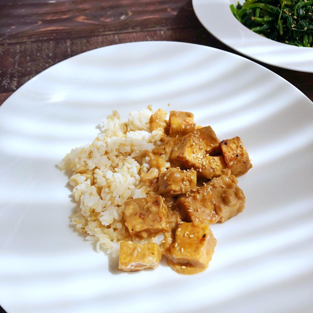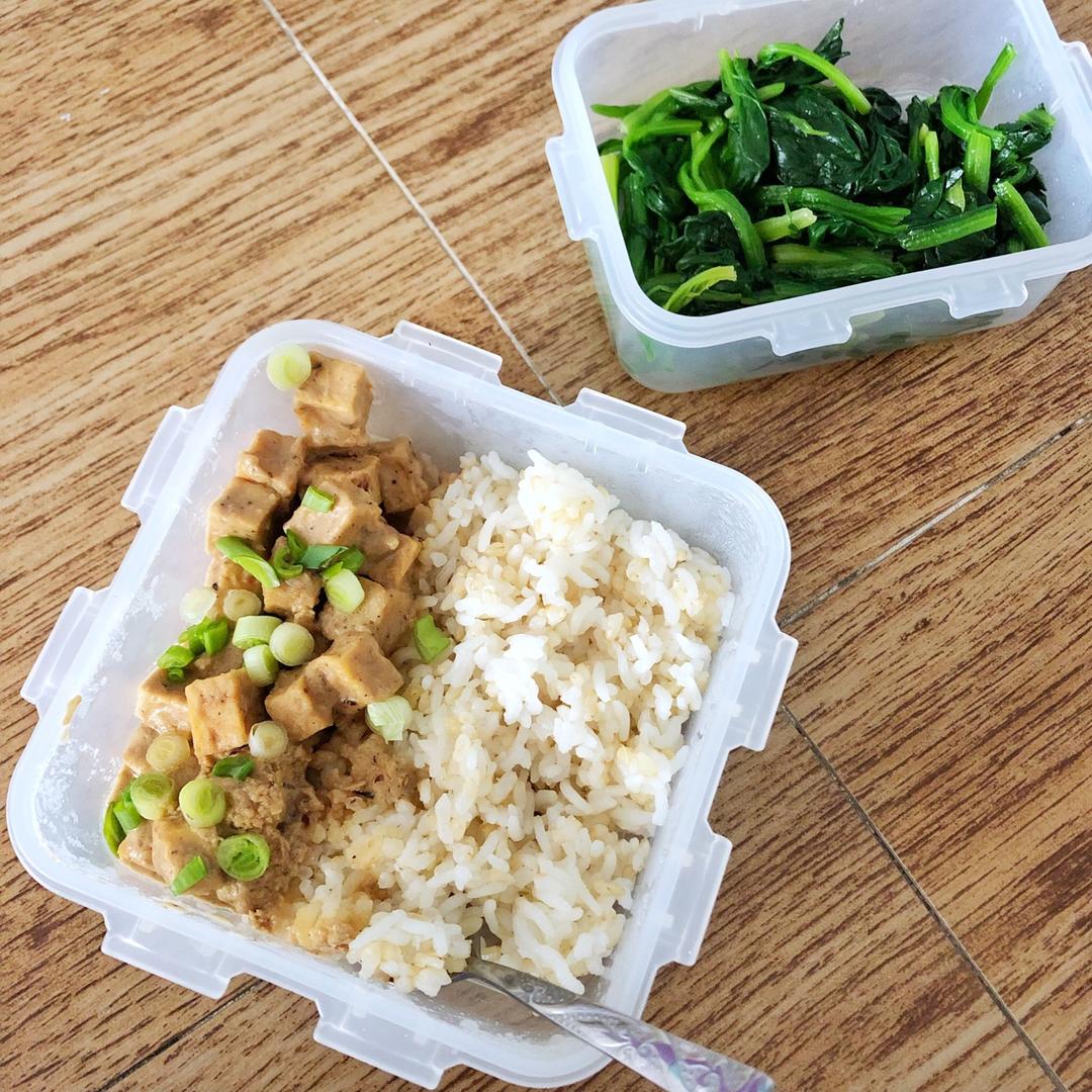 带饭,也没办法加热,就直接吃的常温的,但是还是很好吃。一口下去超级满足,心情也好了很多。豆腐的水分被我压的太久压没了,哈...