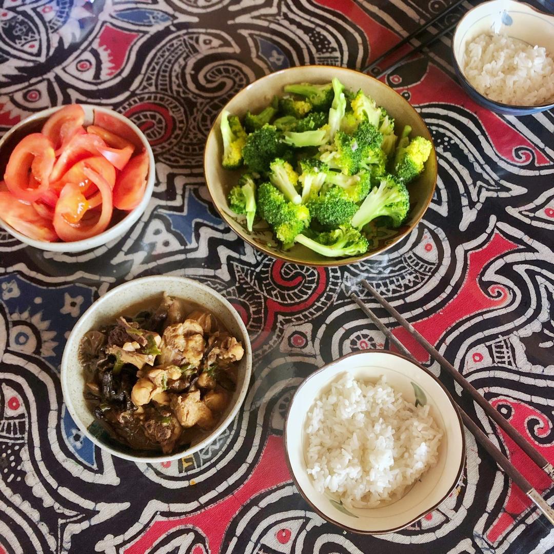 有荤有素有蘑菇(可能没看出来那一小盘其实是鸡腿炖榛蘑😬)有主食