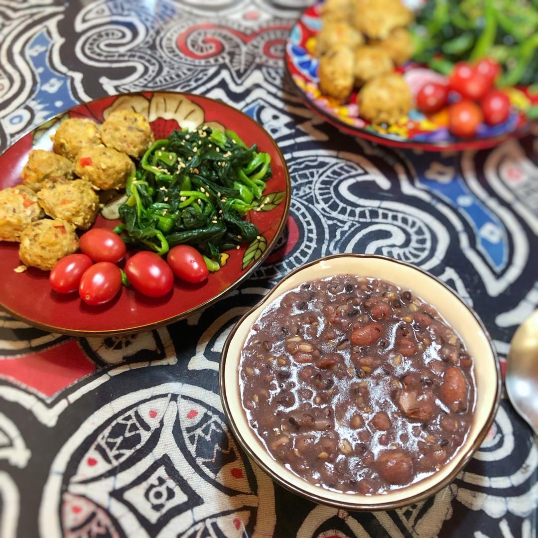 猪肉鸡肝丸。搭配杂粮粥 拌菠菜。好好吃
