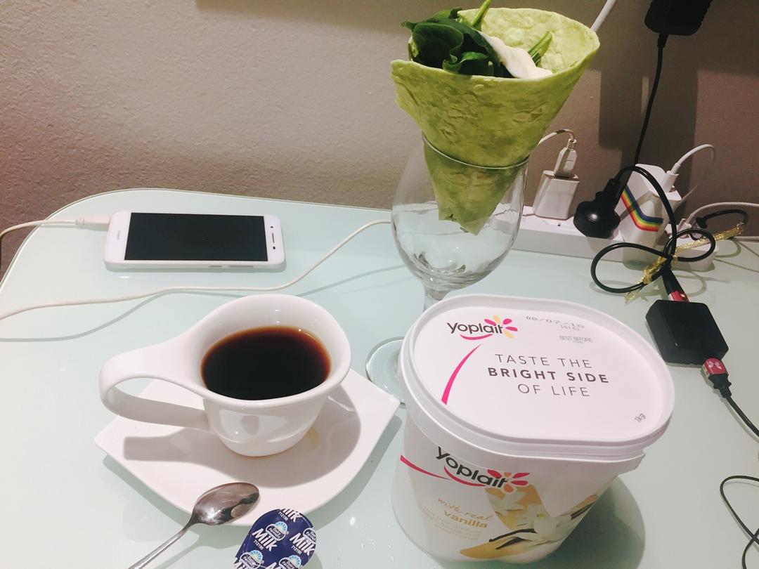 在悉尼的第一个早晨……自制早餐是健康的咖啡,酸奶,蔬菜卷饼。昨天吃太多了(图四午饭,图五晚饭),今天要清淡点。 #早餐•...