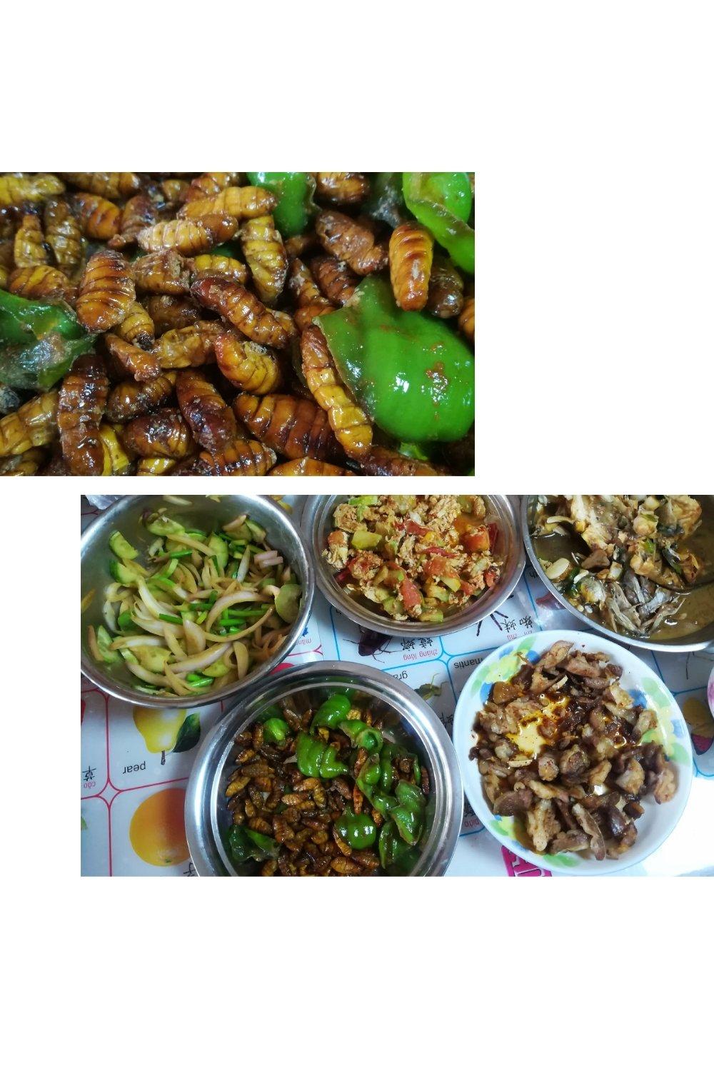 今天的午饭出自我嫂子之手😄蜂蛹 西红柿鸡蛋炒葫芦瓜 炒羊肉 红烧鲈鱼 清炖羊肉