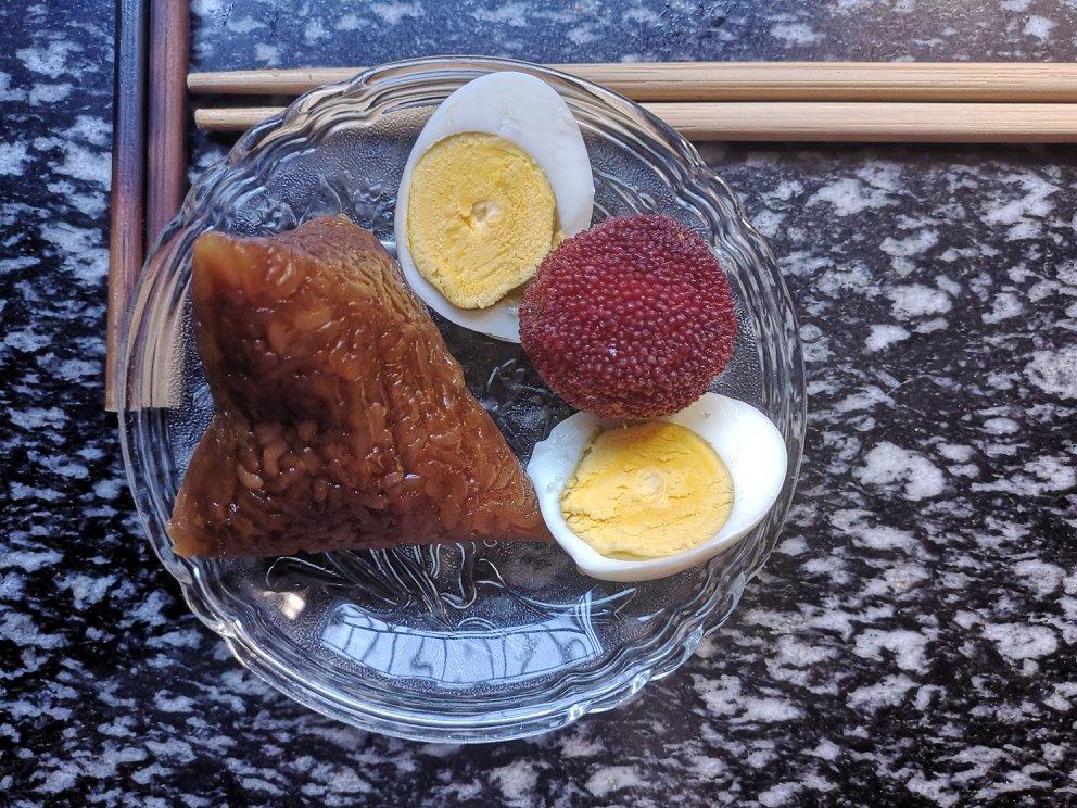 早餐是一个粽子,一个水煮蛋,一个杨梅,还是挺丰富的。粽子是在端午节的时候包好的放在冰箱冷冻...