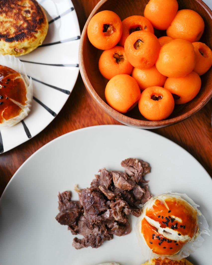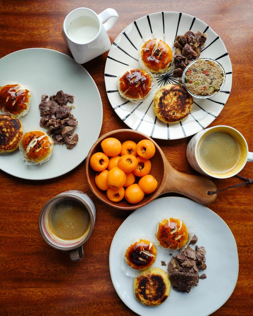 剩的自制老婆饼,煮牛肉,煎土豆饼,枇杷