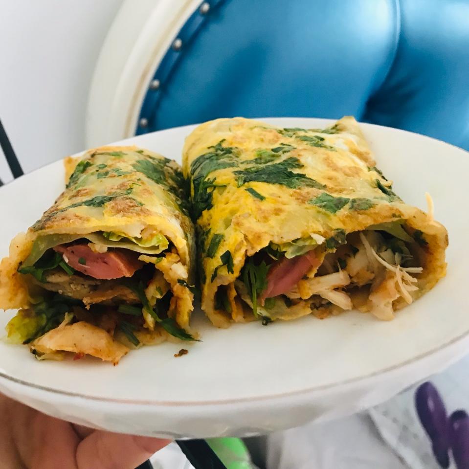 锅较小,所以鸡蛋先打匀再放,3个饼皮两...