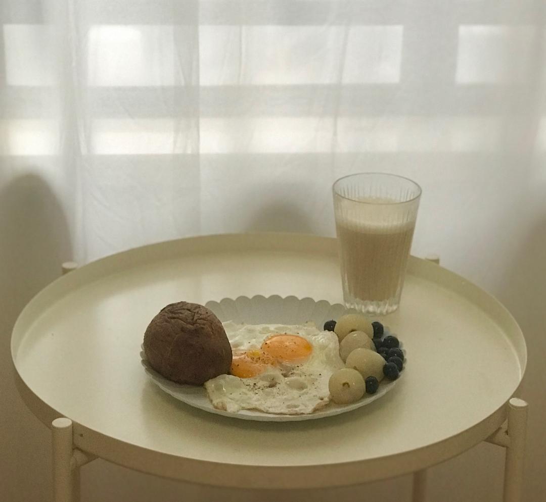 丢糖包、煎蛋🍳、荔枝、蓝莓、豆浆