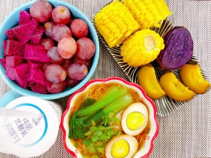 今日早餐。脆皮香蕉,水煮蛋,孜然土豆,牛奶。葡萄。