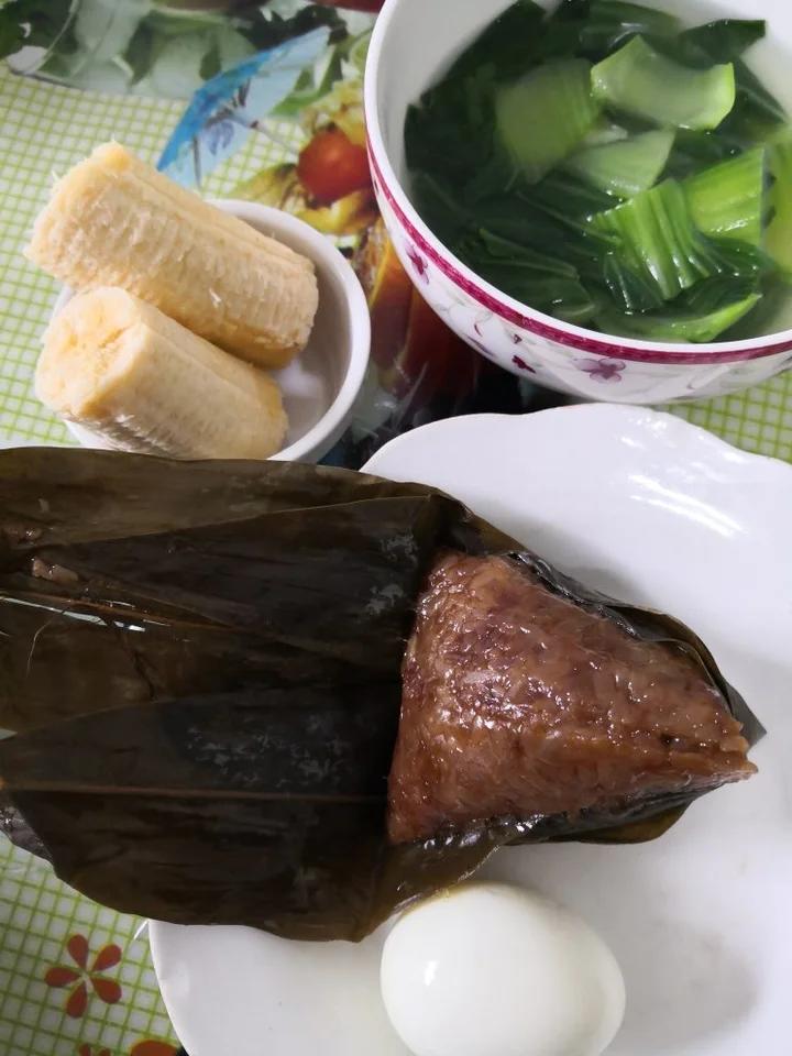 肉粽、煮青菜、煮蛋、香蕉