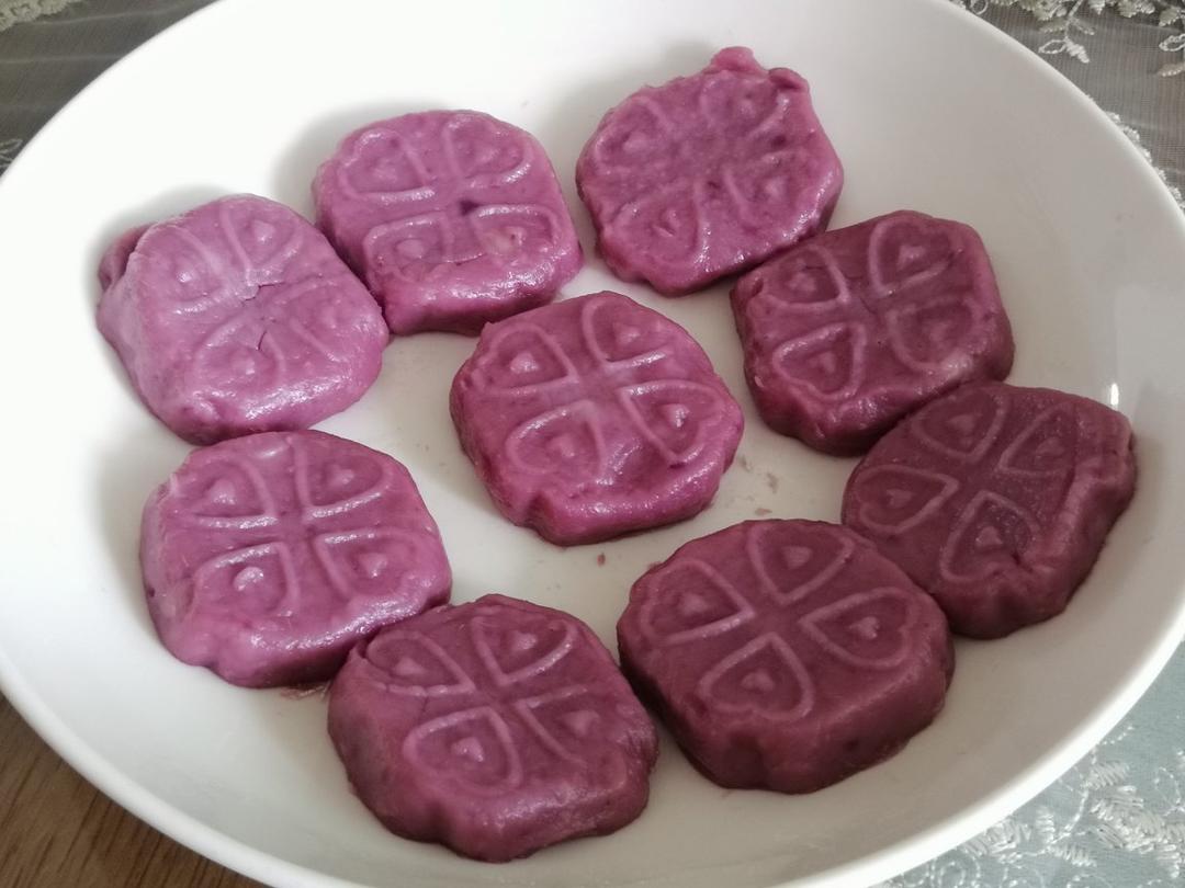 本来是想做山药紫薯泥压模成型的,因为山药蒸得不够软压不成泥,加水加糯米粉面粉,做成山药紫薯糯米糕了😄,里面夹点豆沙