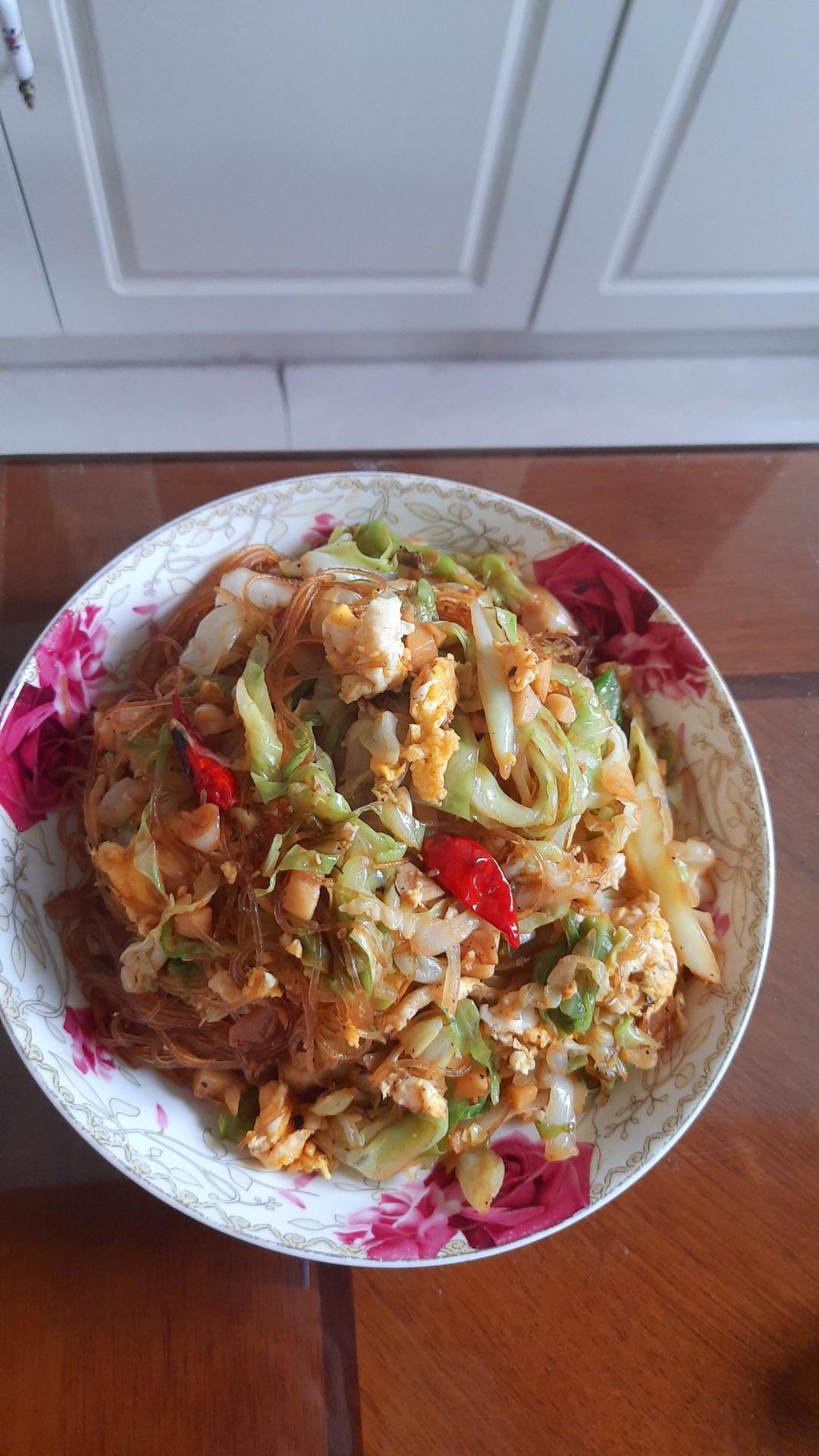 出锅前放了煎好的鱼糕,加上烤箱烤过的花菜和西葫芦片,拌好之后可香了!...