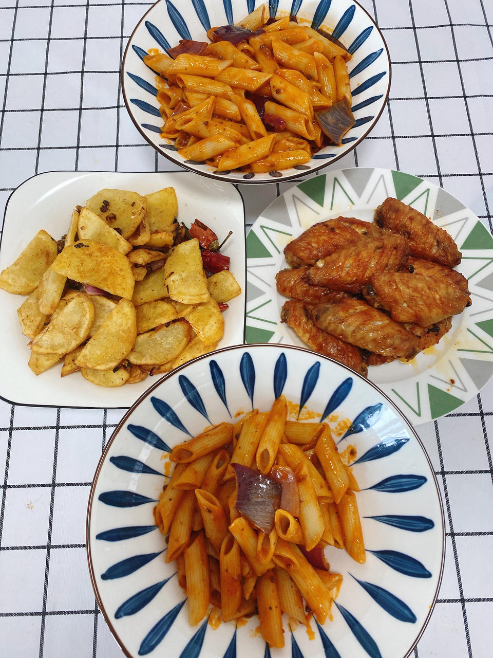 椒盐土豆片 奥尔良烤翅 番茄牛肉沫意面