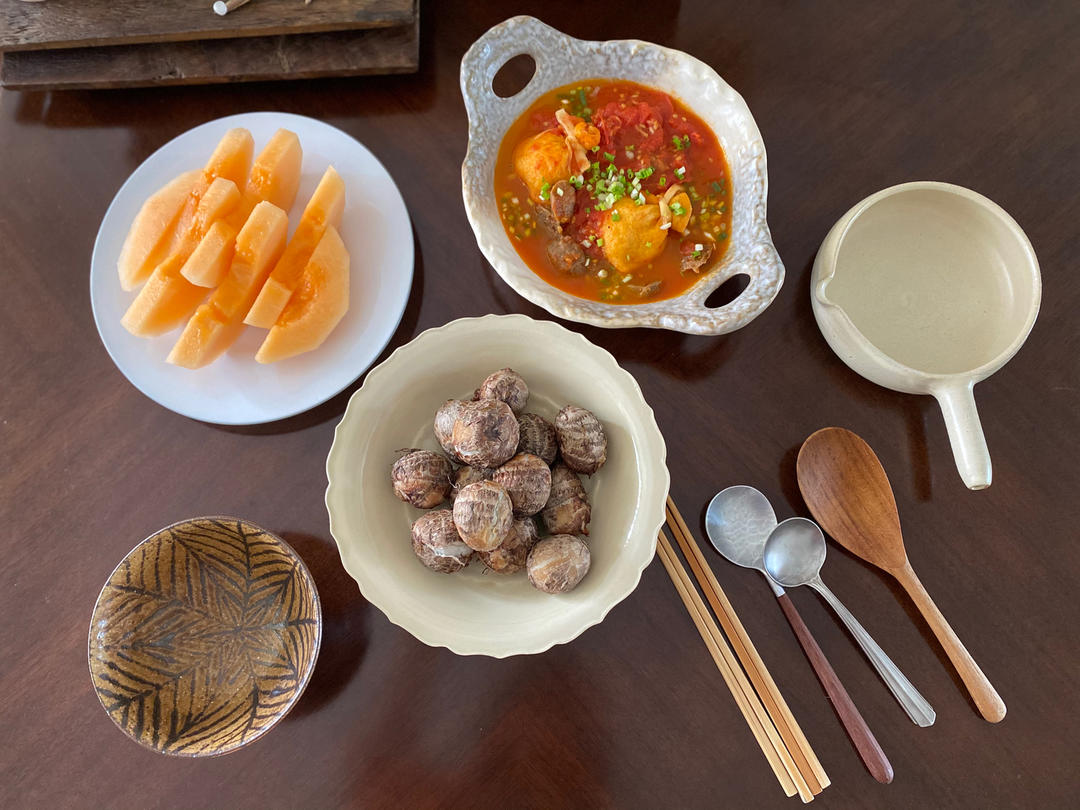 ♥️二人食。番茄丸子汤、蒸芋仔、蜜瓜。神兽说:麻麻,为什么晚上带我去...