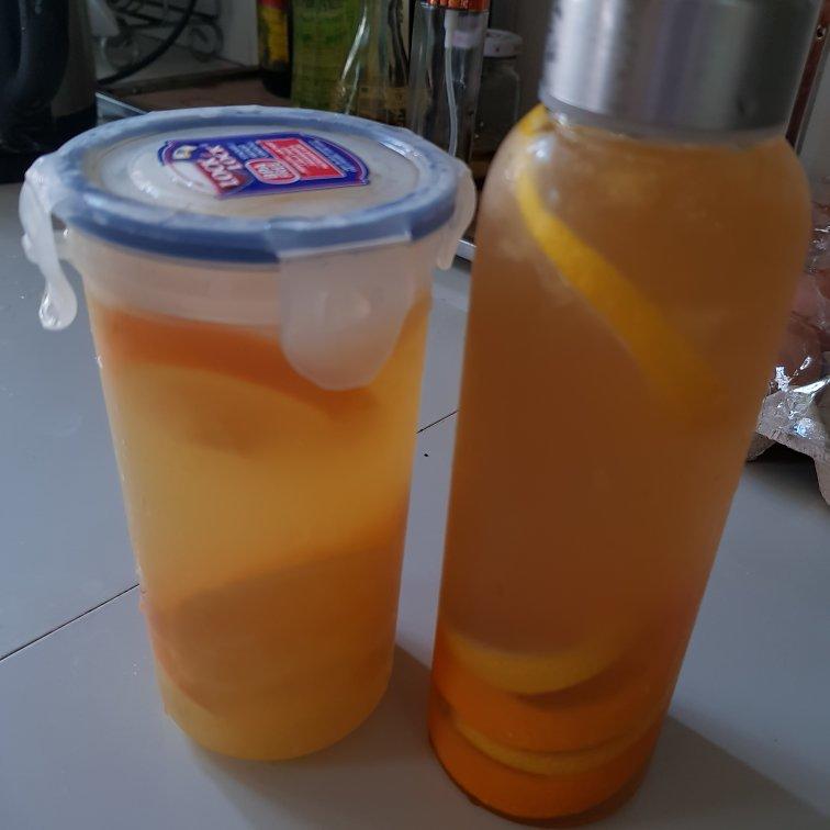 午餐后的解腻饮料,用了一粒橙,半粒柠檬,约800ml水。左边瓶子加冰糖+白糖,比较难掌握...