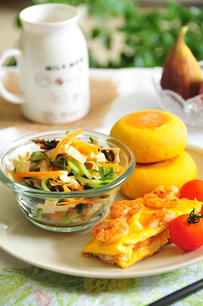 午餐:素什锦:木耳、香菇、腐竹、黄瓜、胡萝卜,虾仁滑蛋,南瓜小米面小饼,鲜奶,无花果,桃子,小番茄。
