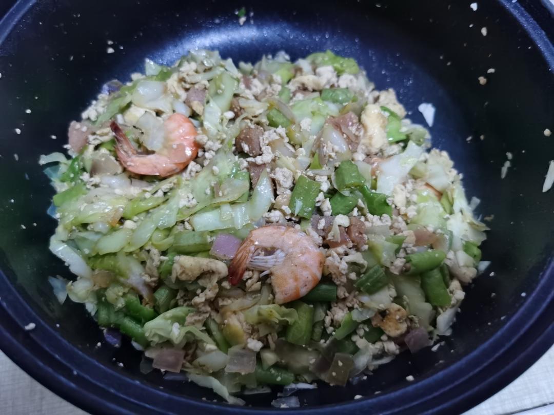 这里面有:鸡蛋,洋葱,虾,香肠,豆角,包菜,豆腐