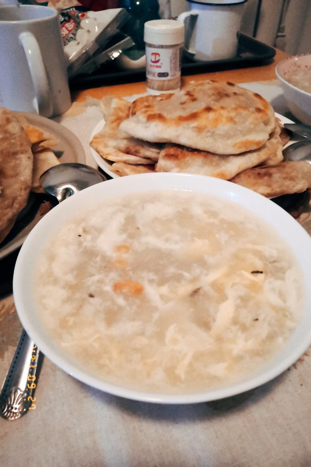 海米蛋花汤+榨菜鲜肉饼。