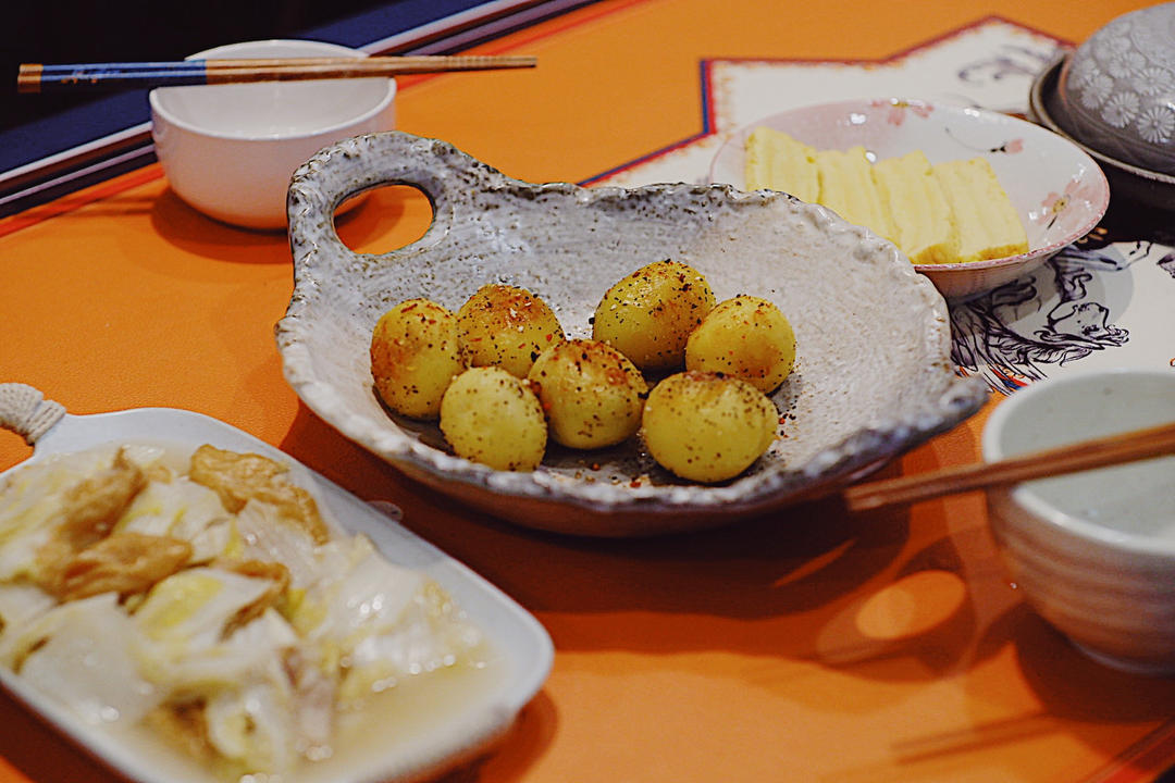 蜂蜜胡椒盐小土豆&煎牛肉&厚蛋烧&白菜油面筋。女儿...