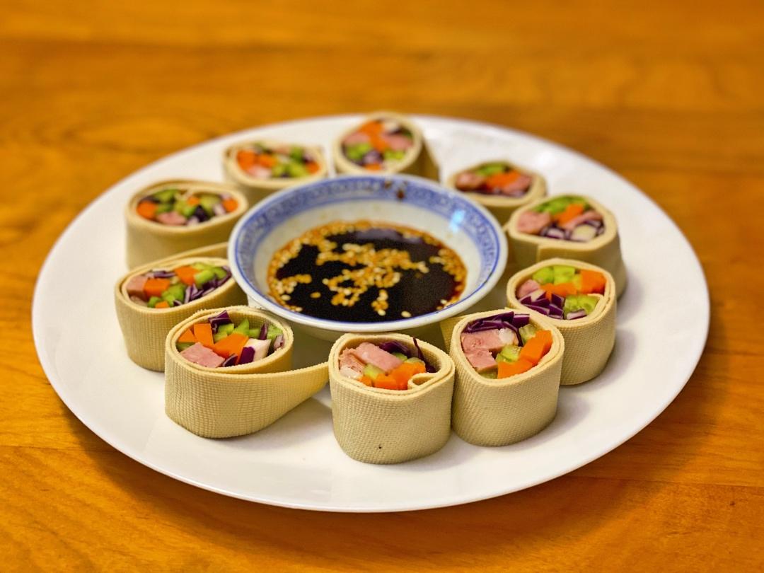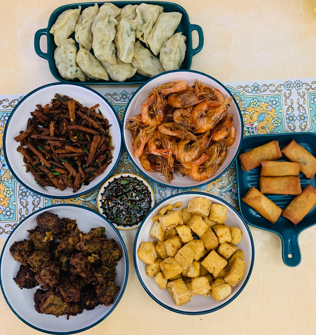 晚餐菜单:葱炒肉丝、炸虾、炸豆腐、炸春卷、炸萝卜丝丸子、萝卜丝煎饺