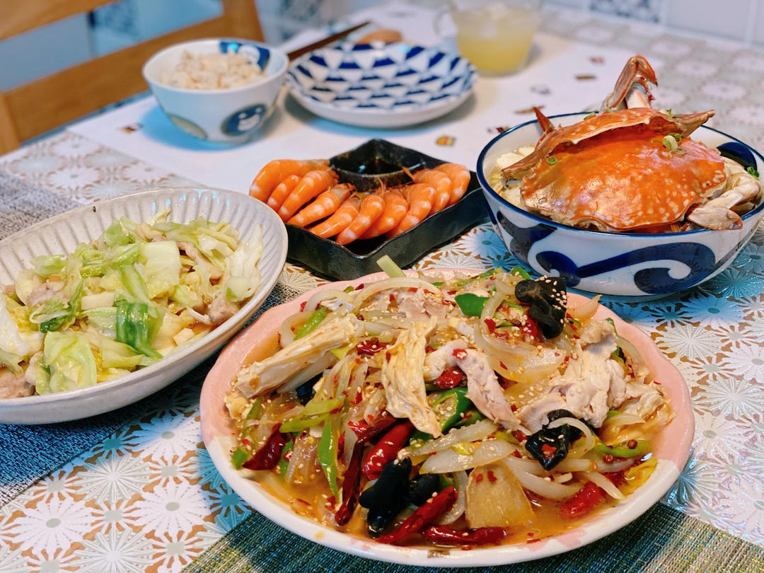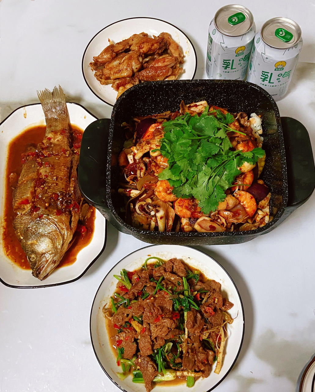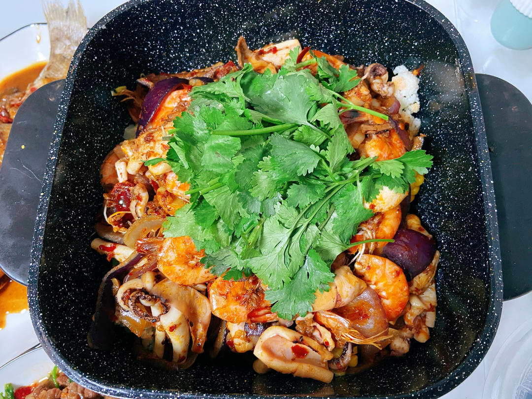 鱿鱼虾干锅,香煎鸡翅,香菜拌牛肉,红烧鲈鱼