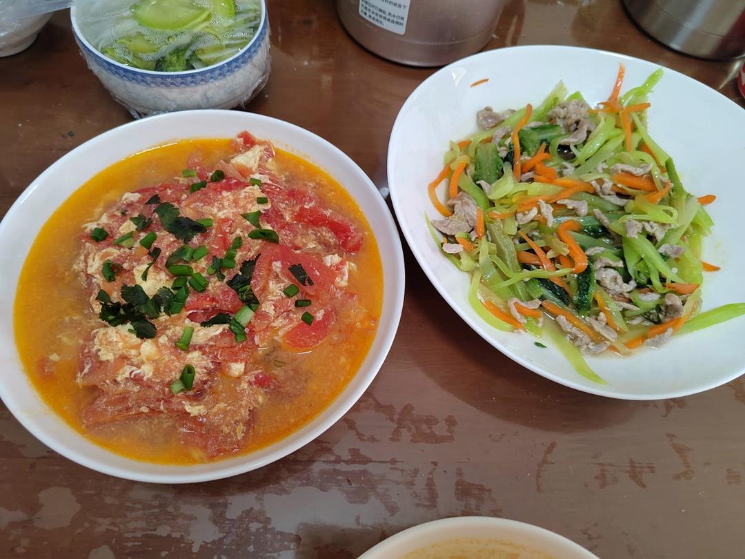 DAY1 五花肉炒刀豆 杏鲍菇炒胡萝卜 西红柿蛋汤