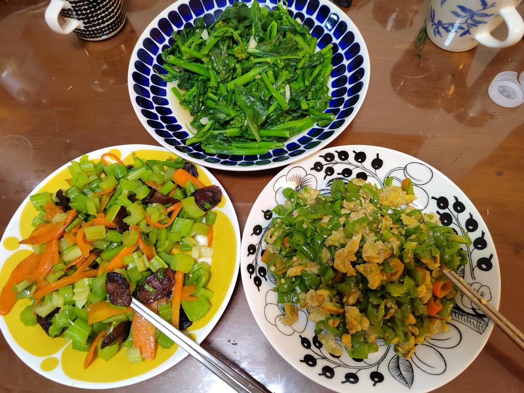 今日晚餐:糖醋排骨,白灼大虾,鸡丝卷,韭菜炒鸡蛋,芹菜炒肉,红烧鸡翅根。