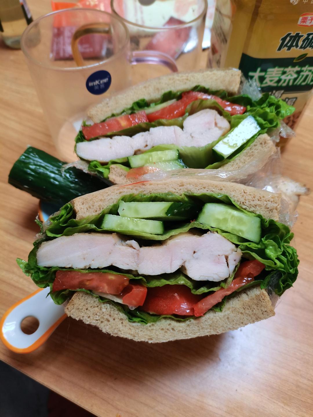 代糖全麦面包,鸡胸肉是我老公腌好再烤的,没有酱汁,争取低卡健康