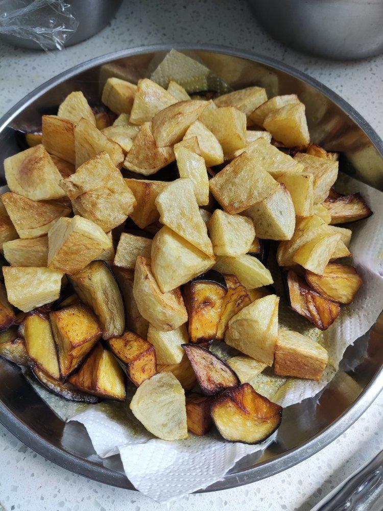 原料:土豆,长椒,圆茄挂淀粉分别过油,长椒呈虎皮色,合锅倒入料汁(生抽、老抽、耗油、糖、清水)翻炒均匀,出锅拍点蒜,提味...
