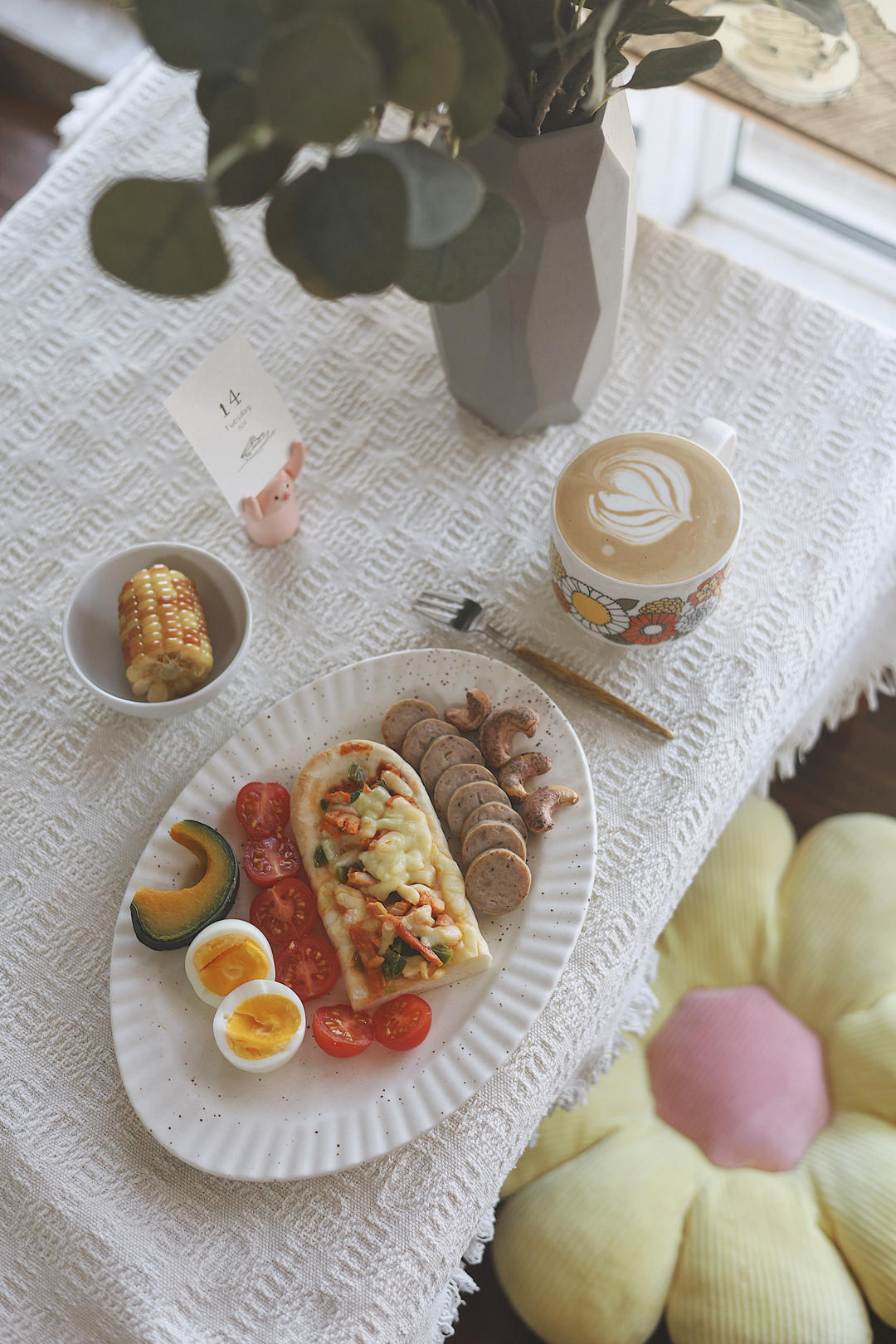 周二,晴,饺子牛奶燕麦荷包蛋