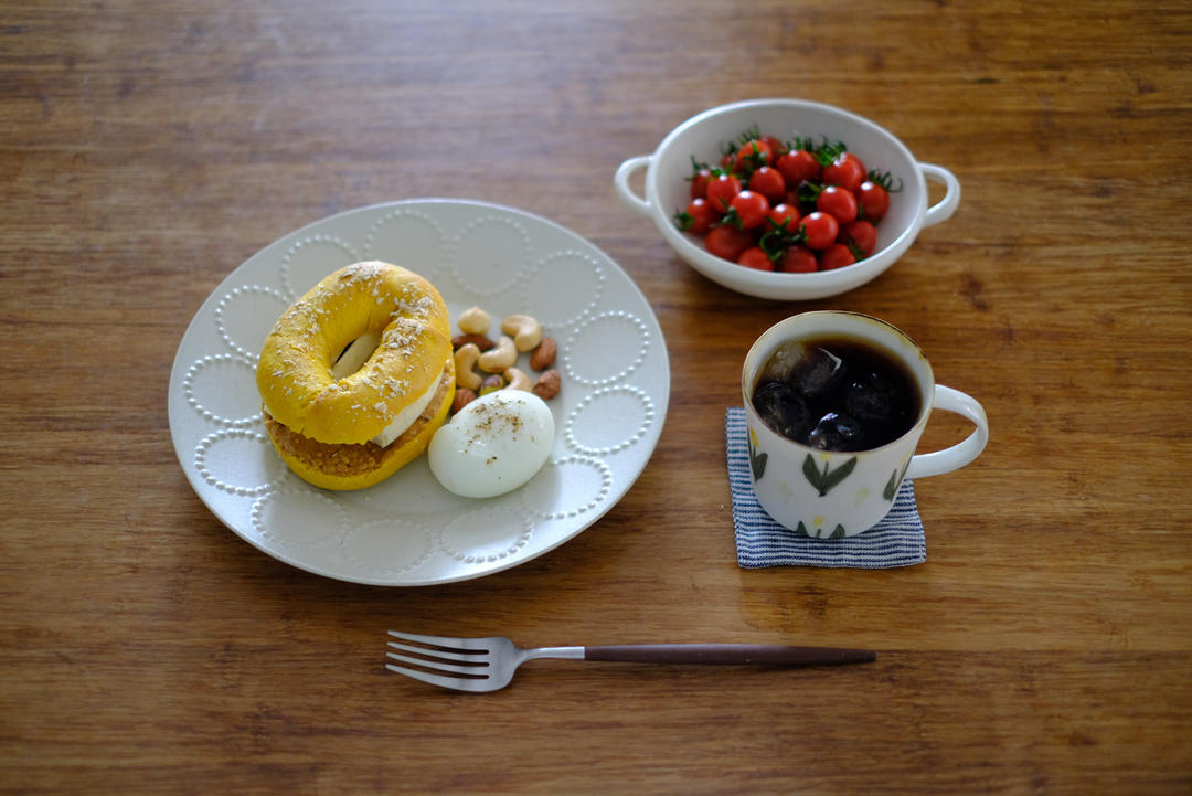 花生酱香蕉贝果|水煮蛋|坚果|番茄|冰咖