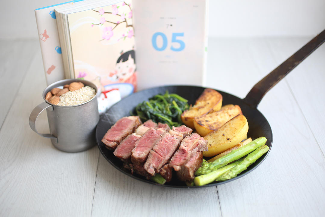 2022/7/5六月初七:牛排/煎土豆菠菜芦笋/燕麦果干酸奶