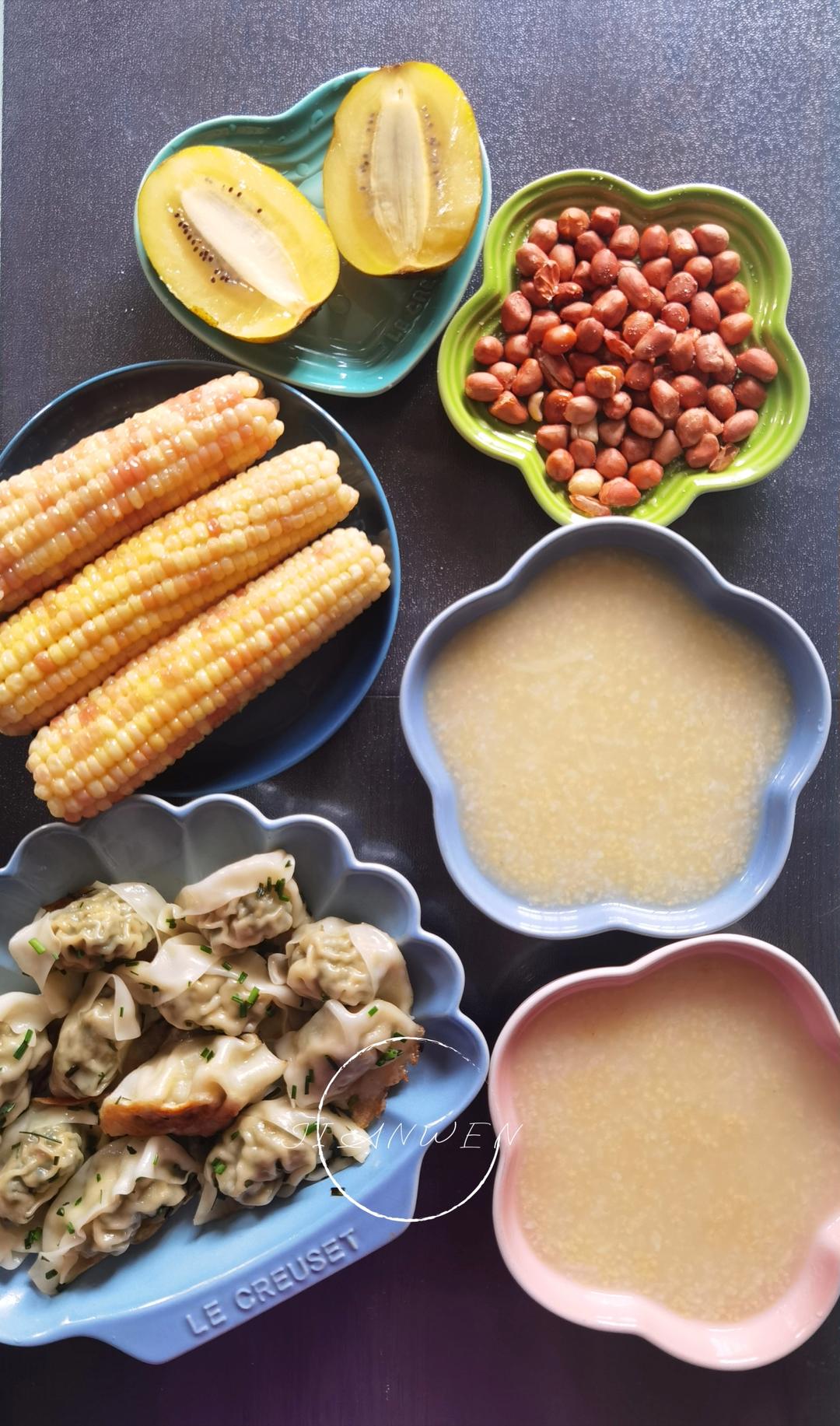 小米粥、煎馄饨、玉米、猕猴桃❤️