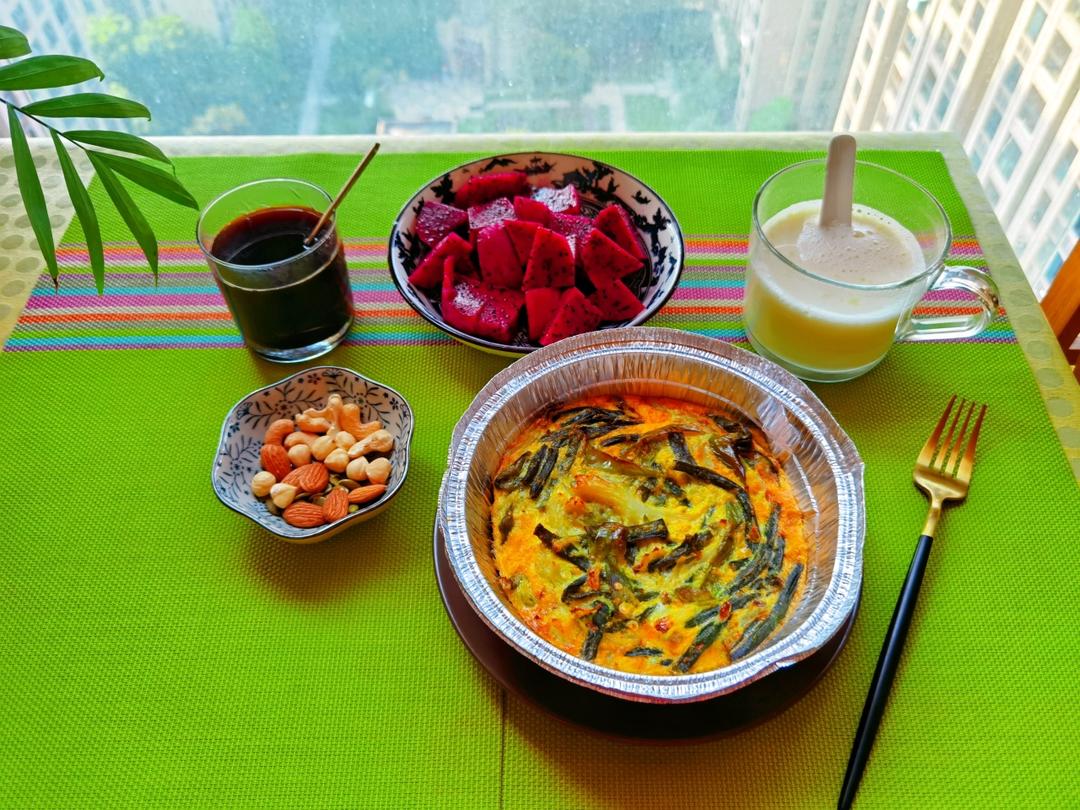 【早餐心语】认真过好每一天,哪怕是重复。烤蔬菜鸡蛋饼、坚果、无糖豆浆、黑咖啡、火龙果。