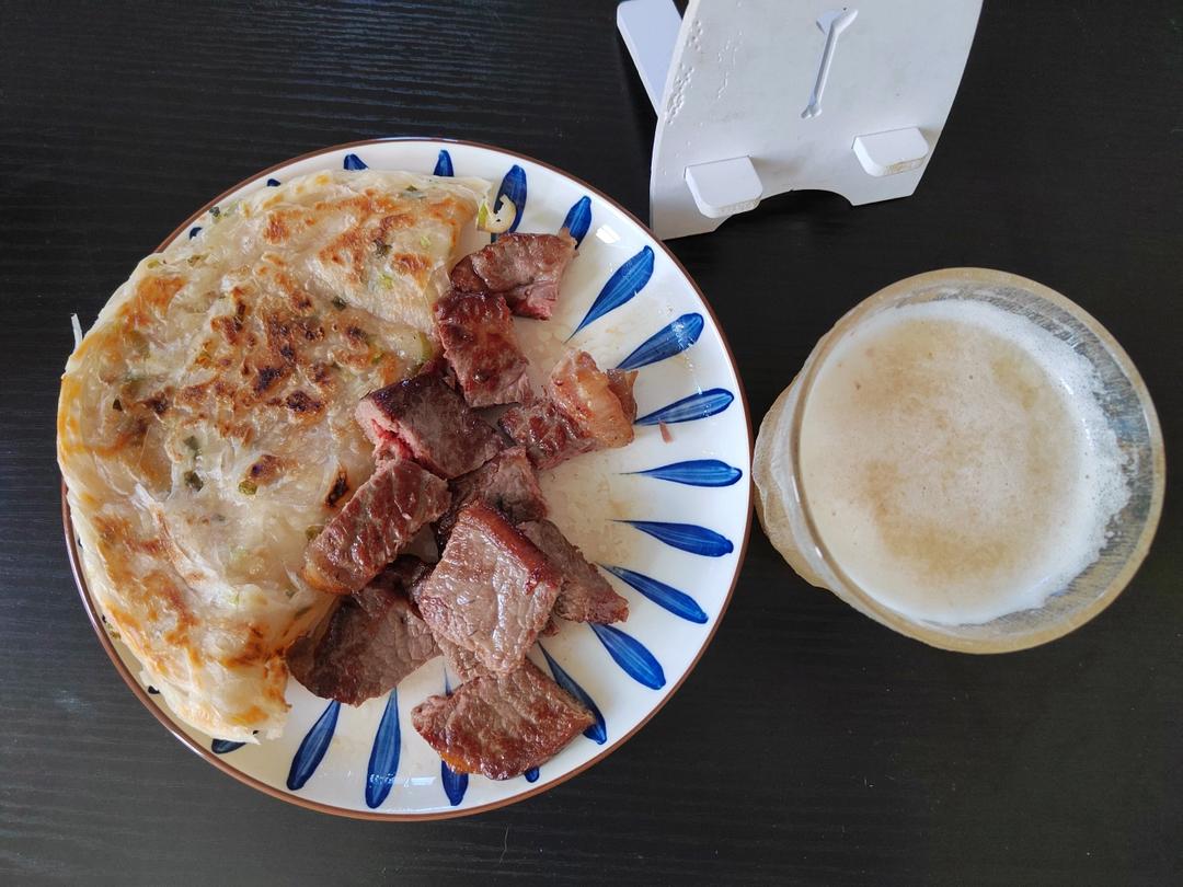 手抓饼 牛排和冰荔枝冷泡茶