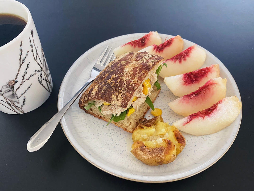 优秀的恰巴塔塞满金枪鱼肉+甜玉米粒+芝麻菜,煎一下压扁的小土豆抹上黄油盐曲酱,最后以一个贼甜的桃子收尾