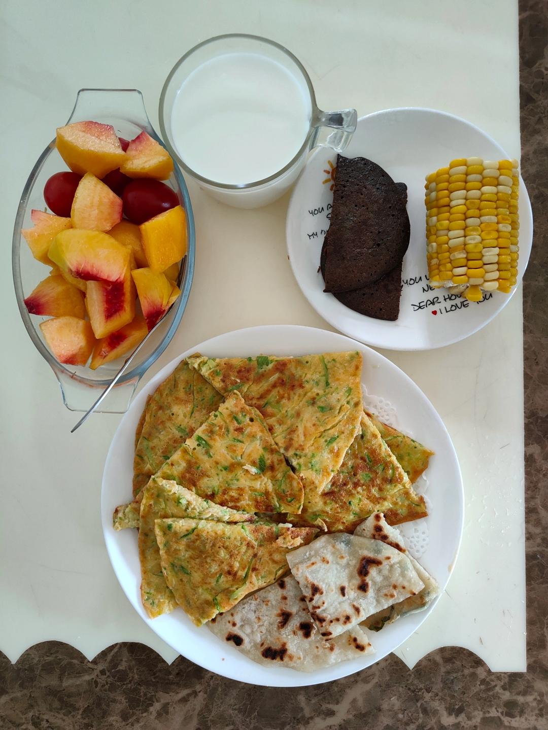 西葫芦饼,黑咖啡☕,葱花饼松饼,玉米🌽,黄桃